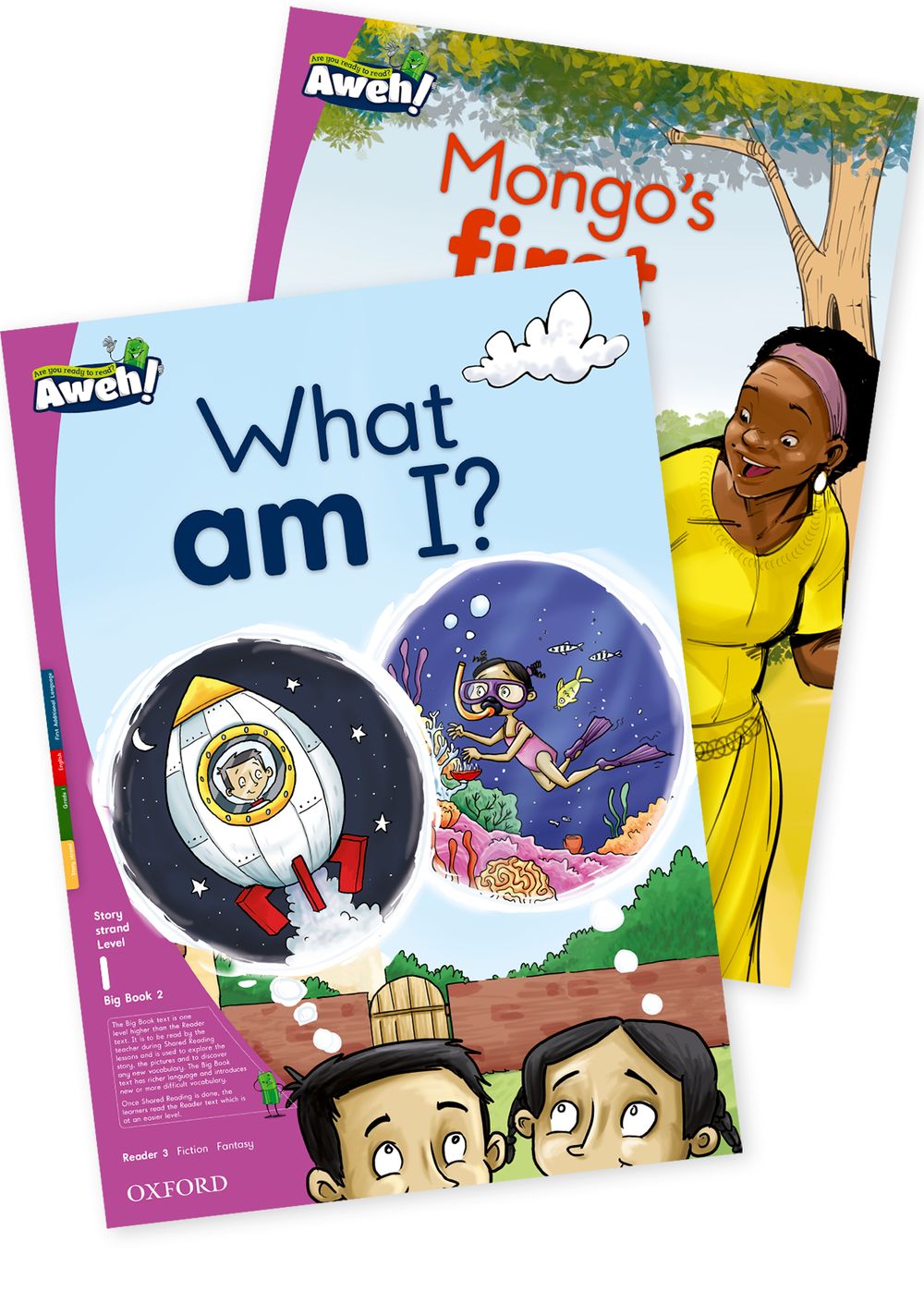What am I? and Mongo’s first day is the second Big Book of Level 1 in the Aweh! English First Additional Language reading scheme. Aweh! is a graded reading scheme that will awaken any child’s imagination as they join Mama Africa in saving the world’s stories by charging the Umthombo; the well of stories. The bright and colourful artwork provides a child-centred learning opportunity that integrates both the weekly Mathematics concept and the Life Skills topic. The inside cover identifies the key vocabulary and phonic focus for every Reader. The back inside cover offers a fun writing activity to consolidate the child’s understanding and to link reading to
