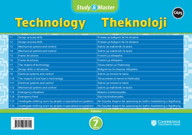 The Study & Master Natural Sciences Grade 7 Flashcards highlight interesting facts from the Study & Master Natural Sciences Grade 7 Learner’s Book and is aligned to the CAPS Natural Sciences syllabus. This product consists of 16 double-sided, A5 size flashcards with English text on one side and the equivalent isiXhosa or Sesotho text on the other, packed in a plastic sleeve with a contents list in both languages for easy reference and use. These will help learners revise and become familiar with Natural Sciences terminology in both languages. They can be used by learners individually, in pairs or groups.